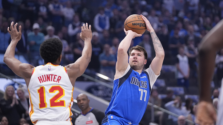 达拉斯小牛队的卢卡·东契奇在对阵亚特兰大老鹰队的比赛中投篮。